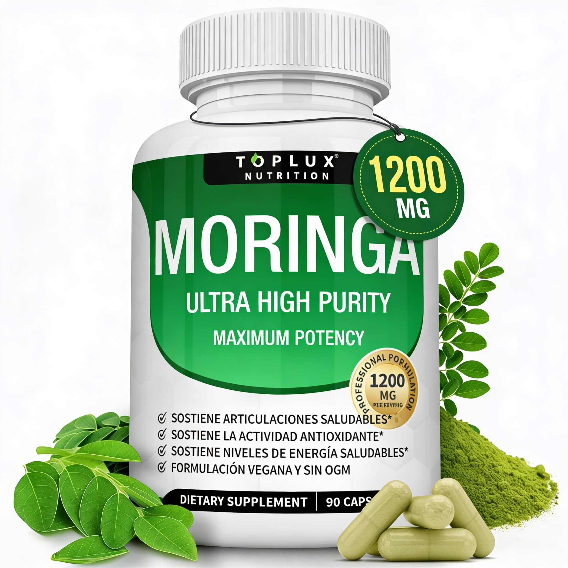 Porque la moringa ya es un complejo nutricional completo por sí sola. 92 nutrientes en una planta. No necesita rellenos, ni aglutinantes, ni “complejos” artificiales. Un solo ingrediente puro, en la dosis correcta (1200mg), es más efectivo que 10 ingredientes diluidos.